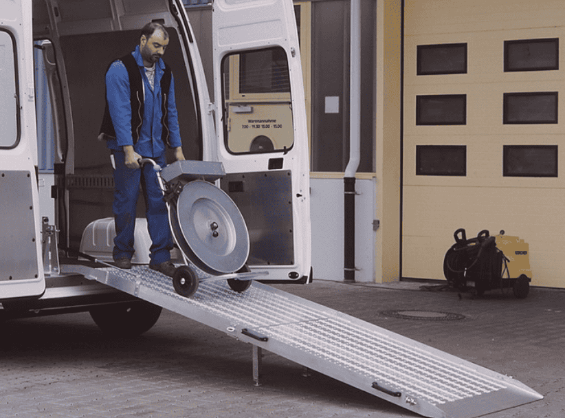 Speziell für Gebäudereinigungsfirmen, Bäckereien oder Kurierdienste wurde die Einbaurampe Typ RRK entwickelt. Die leichte Bedienbarkeit beschleunigt und vereinfacht die Abläufe beim häufigen Be- und Entladen. Gaszylinder gewährleisten einen geringen Kraftaufwand beim Bedienen. Die gelochte Fahrfläche bietet eine hohe Rutschsicherheit und durch die Lochung kann Regen, Schnee und Schmutz schnell entweichen. Während der Fahrt steht die Rampe in senkrechter Position und wird durch entsprechende Verschlusssicherungen gehalten. Integrierte Gummipuffer verhindern Klappergeräusche.