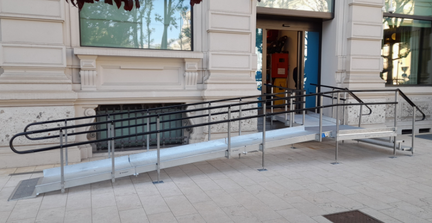 Für öffentliche Gebäude, Gewerbe, Einrichtungen, Veranstaltungsorte oder Zugänge mit höherer Frequenz. Die Konstruktion ist als permanente Modulrampe gedacht, mit hoher Stabilität und sauberer Systematik über Rampenläufe, Podeste, Geländer und ergänzende Komponenten.